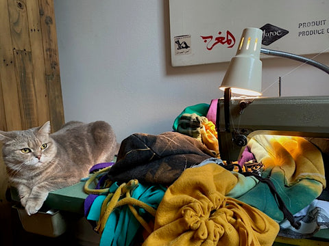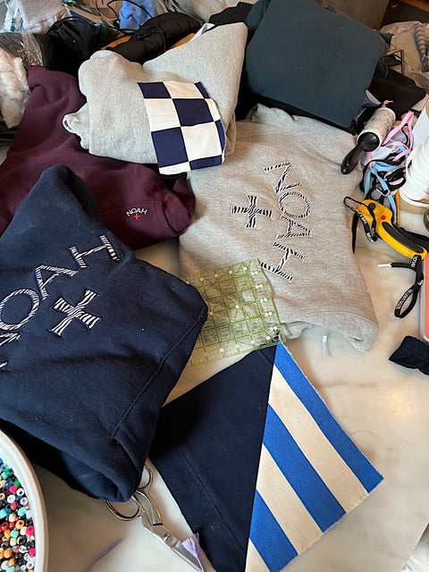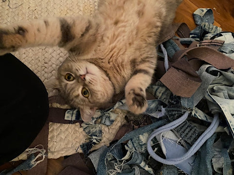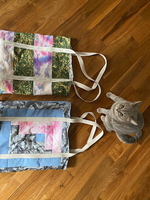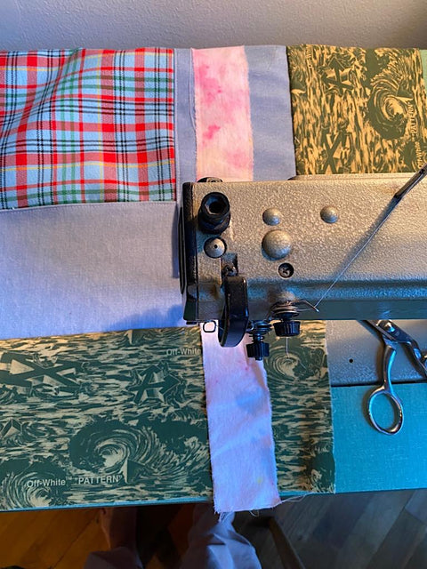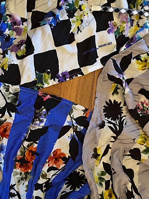 Though Ehlke exited her company in 2004, she continues to explore ways to repurpose textiles, mixing and matching, fraying and pleating — which Abloh coined “the crash of fabrics.” The Off-White™ designer generously shipped his surplus and sample yardage from his Milan fabric house and kickstarted Ehlke’s artistic practice of one-of-a-kind outfits for chairs.