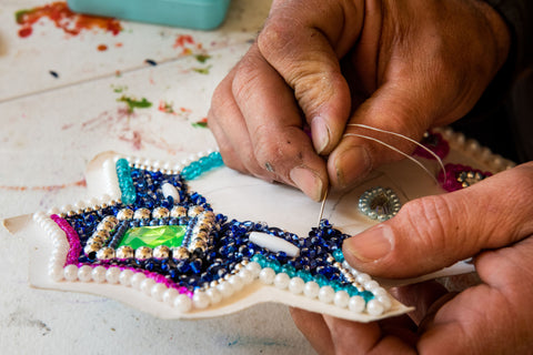 Encouraged by how a number of Uptown Indians were exploring other channels to reconstitute their work, DuVernay was inspired to take his grand suits, disassemble them and connect the patches into tapestries that tell stories about his community. Over the past year, Duvernay has developed this practice with his wife Jennie Wimbish and their close friend William McLain IV.