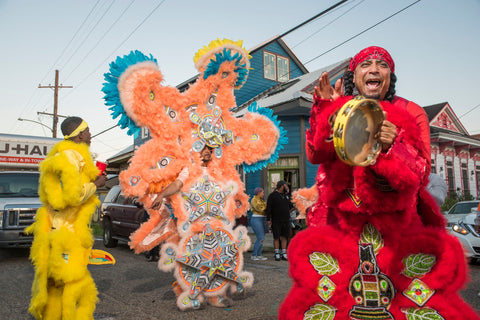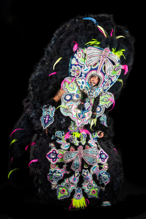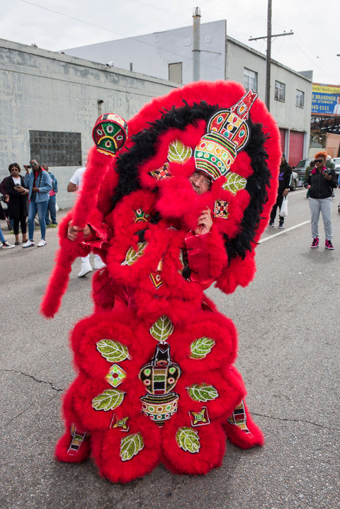The tradition of Mardi Gras Indian suit making was born in response to the French colonial rule of Louisiana. Many black individuals who escaped their indentured servitude found refuge in indigenous communities, where they covertly traded goods, shared information, and eventually intermarried, hence the name “Black Masking Indian.” Half a century after the first New Orleans Mardi Gras parade took place in 1837, approximately fifty Plains Indians in native attire marched unannounced in the 1885 procession. It was an act of celebration and defiance. In subsequent years tribes consisting of both Native Americans and Africans began to form, and they later competed over whose big chief donned the grandest suit. Today the Mardis Gras tribes consist of two camps: the Uptown Indians, distinguished by their flat beaded works and depictions of Indigenous culture, and the Downtown Indians, who focus on abstraction and 3D construction.