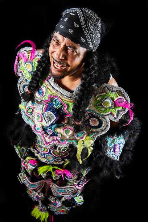 As a member of the downtown “tribe” Monogram Hunters, Duvernay began sewing as a child. He returned to the practice as an adult and started designing his own suits in 2019. With beads and sequins individually sewn, each suit he assembled, with the support of the collective, took upwards of 900 hours to create. This labor of love is one of immense dedication, secret sewing techniques passed on from one generation to the next, and a testament to how legacy endures.